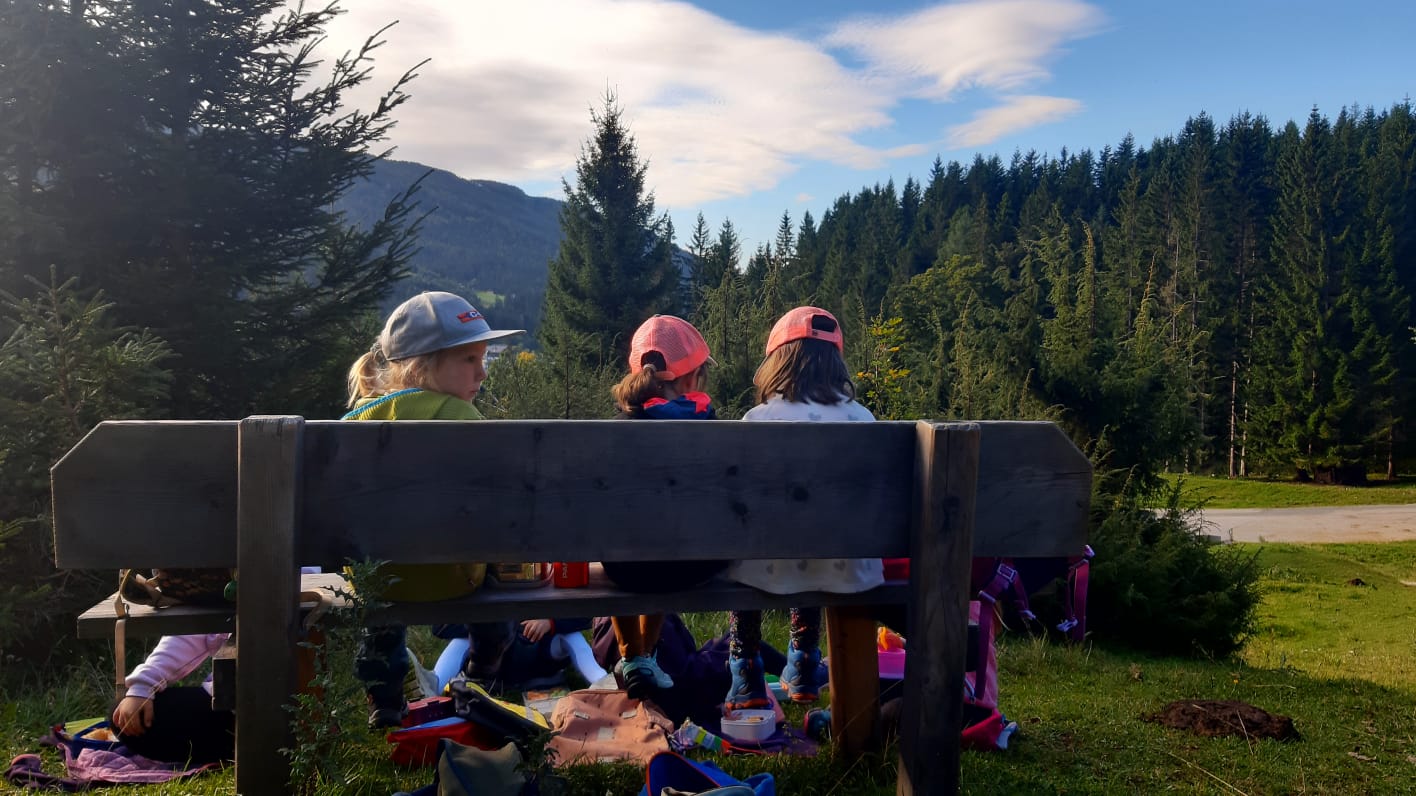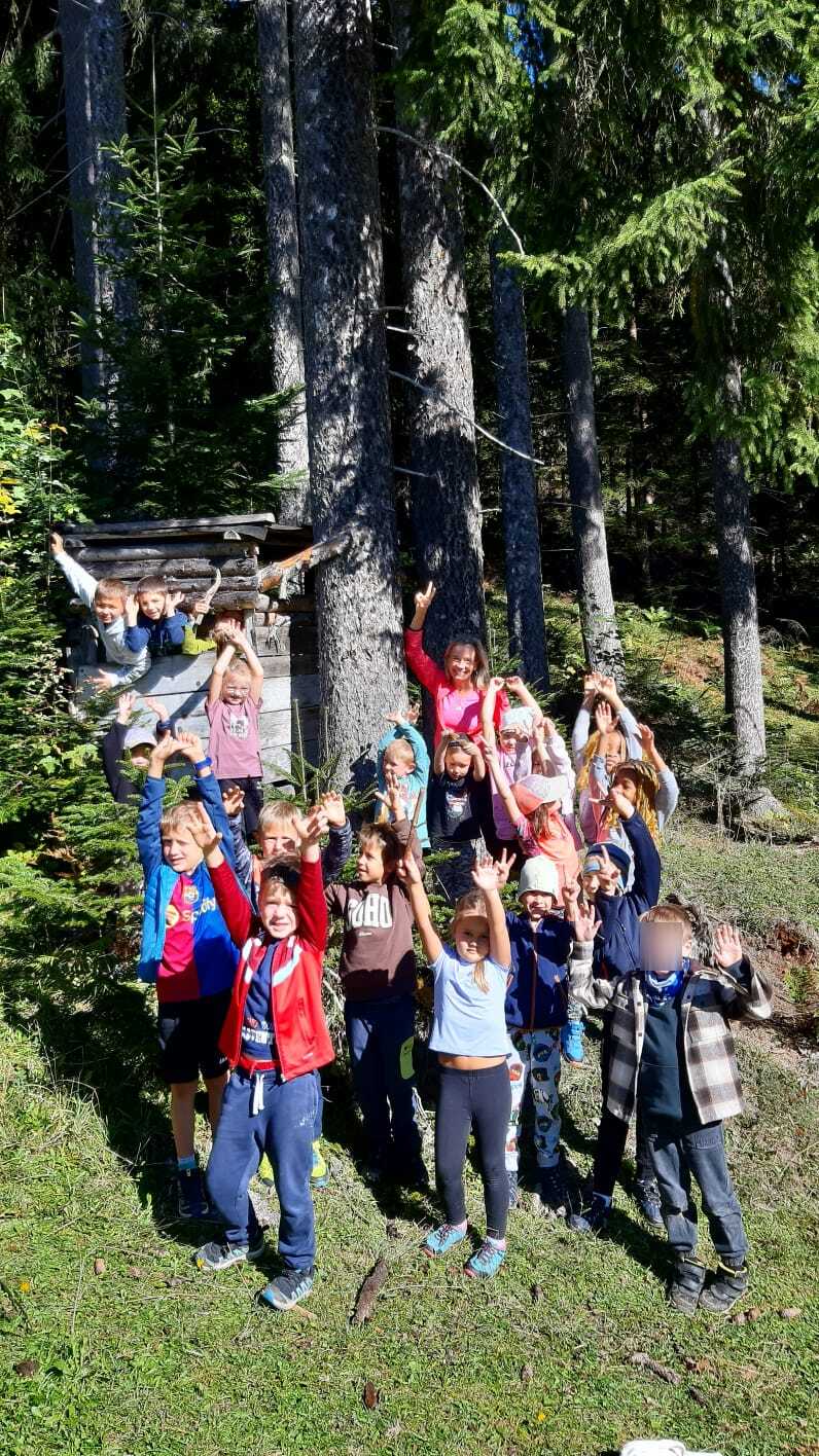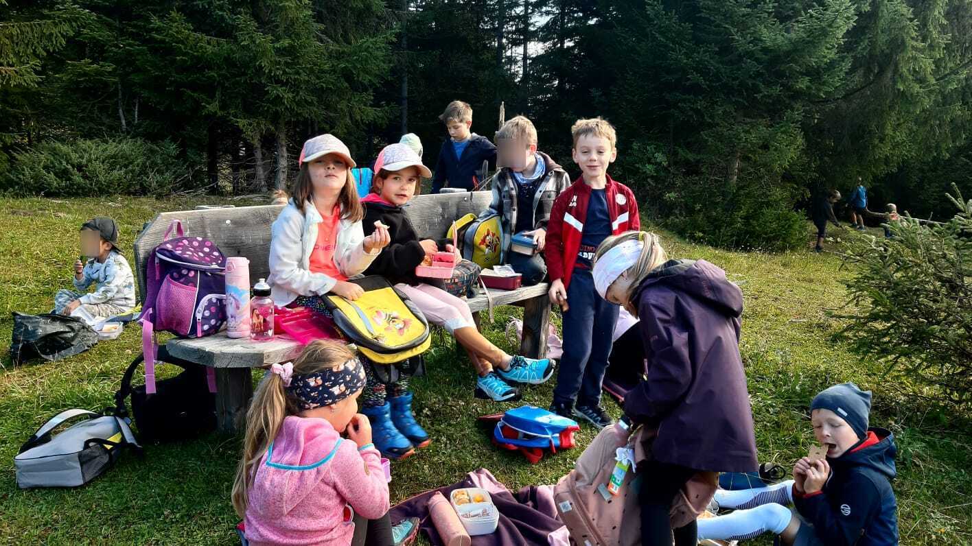 2. Klasse: Höllalm. Nach einer Stärkung und ein paar lustigen Spielen ging es über Zacherleiten wieder retour zur Schule. Auf dem Rückweg verbrachten wir noch eine tolle Zeit beim Bach und im Wald.